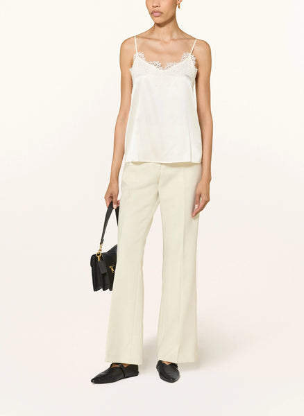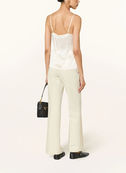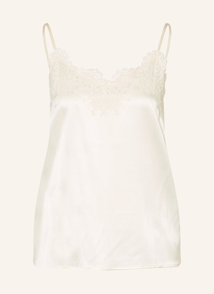 Dieses edle Seiden-Top überzeugt mit seinem zeitlosen, femininen Design. Der gerade Schnitt sorgt für eine fließende Silhouette, während der V-Ausschnitt mit feinem Spitzenbesatz dem Look eine romantische Note verleiht. Verstellbare Spaghettiträger ermöglichen eine individuelle Passform. Die elastische Seidenqualität fühlt sich besonders angenehm auf der Haut an und bietet höchsten Tragekomfort – perfekt solo getragen oder unter Blazer und Strickjacke.