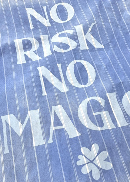 Dieses Blusenkleid verbindet klassische Streifen mit einem klaren Statement. Der blau gestreifte Look wirkt zeitlos und clean, während der markante Spray Print auf dem Rücken mit der Botschaft No Risk No Magic dem Design eine moderne, selbstbewusste Note verleiht.