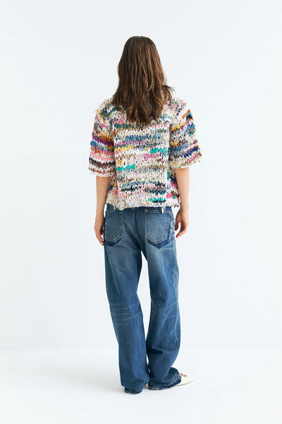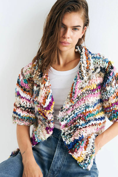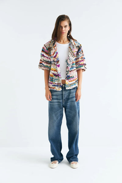 MOA ist eine kurzärmelige Strickjacke mit markanter, moderner Silhouette und weit geschnittenen Ärmeln. Für die Fertigung werden sorgfältig ausgewählte Vintage-Baumwollstoffe von Hand in Streifen geschnitten und anschließend zu individuellen Unikaten verarbeitet. Der aufwendige und zeitintensive Herstellungsprozess verleiht jedem Stück seinen unverwechselbaren Charakter.