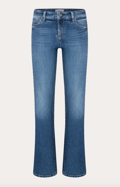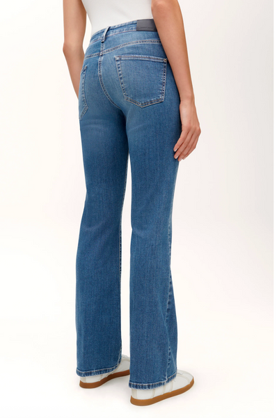 PARIS FLARED Jeans mit ausgestellter Beinsilhouette in Full Length. Die Denim wird aus nachhaltiger Bio Baumwolle gefertigt und sorgt durch Elastizität für Tragekomfort und perfekten Fit. Erhältlich in Blau und Dunkelblau.