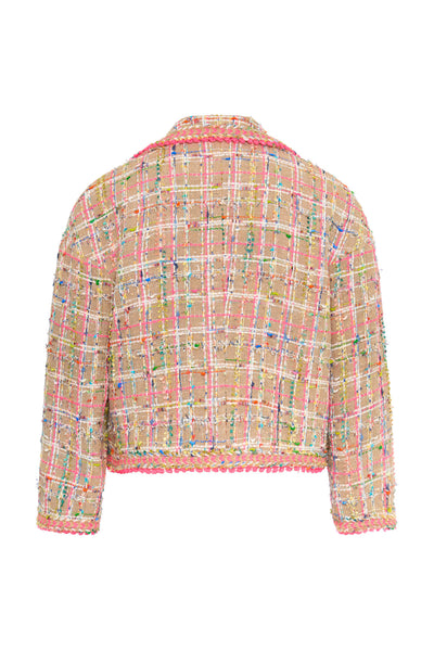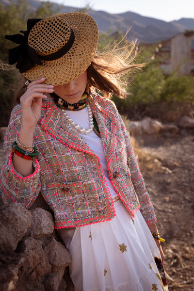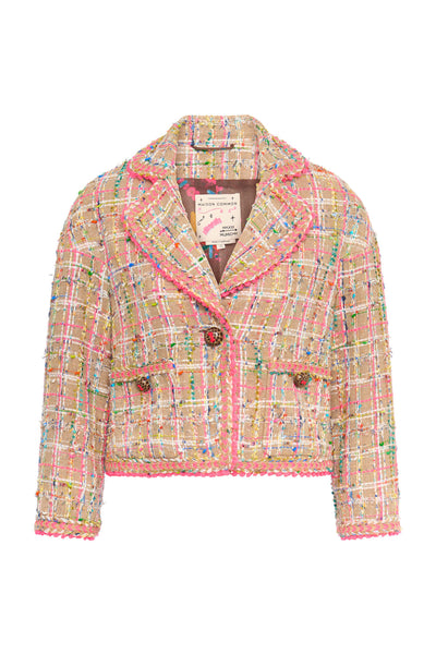 Karo-Tweedjacke aus schottischem Multicolor-Tweed in leichter A-Linien-Silhouette. Aus den Garnen des Stoffes gearbeitete Borten und Paspeln setzen strukturierte Akzente, ergänzt durch Neon-Borten als kontrastierendes Detail. Das Georgette-Innenfutter mit Ethno-Print sorgt für zusätzlichen Tragekomfort.