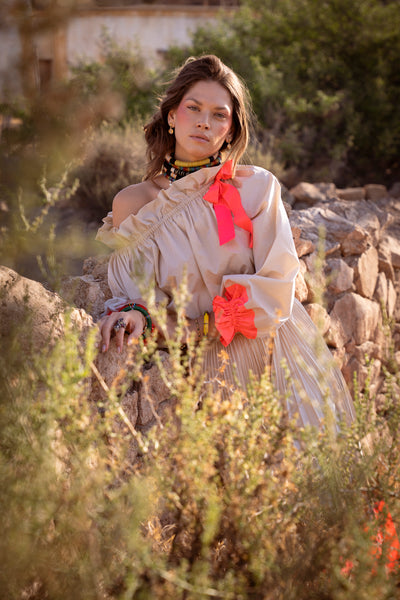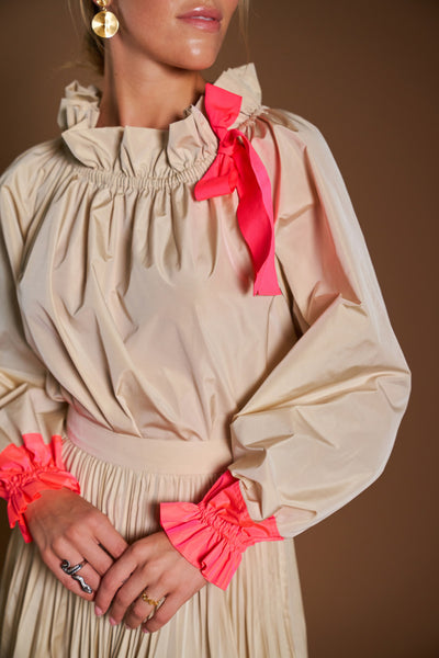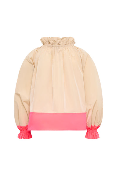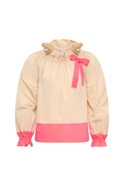 Taftbluse mit Ballonärmeln und dekorativer Schleife. Der elastische Ausschnitt ermöglicht eine flexible Passform und vielseitige Tragevarianten. Kontrastierende Besätze am Körper und an den Ärmelabschlüssen setzen dezente Akzente. Eine Grosgrain-Schlaufe in Kontrastfarbe ergänzt das Design.